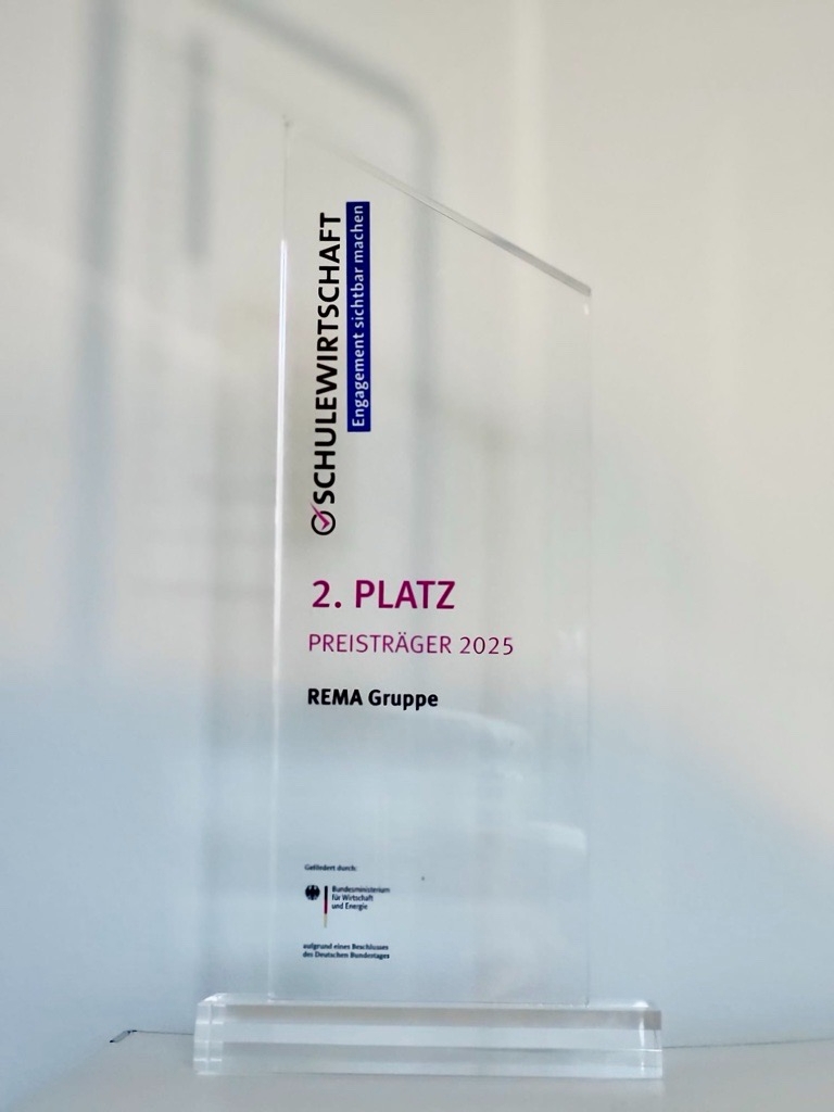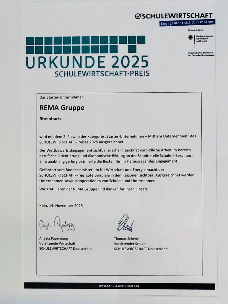 Die REMA Gruppe wurde beim bundesweiten SCHULEWIRTSCHAFT-Preis 2025 mit dem 2. Platz in der Kategorie „Unternehmen Starter – mittlere Unternehmen“ (100–1000 Mitarbeitende) ausgezeichnet. Gewürdigt wurde unser Engagement für praxisnahe Berufsorientierung: das zweisprachige Austauschprojekt zwischen Deutschland und den USA, das von The Halle Foundation, GAPP, der Universität zu Köln und den Transatlantic Career Fellows unterstützt wurde.