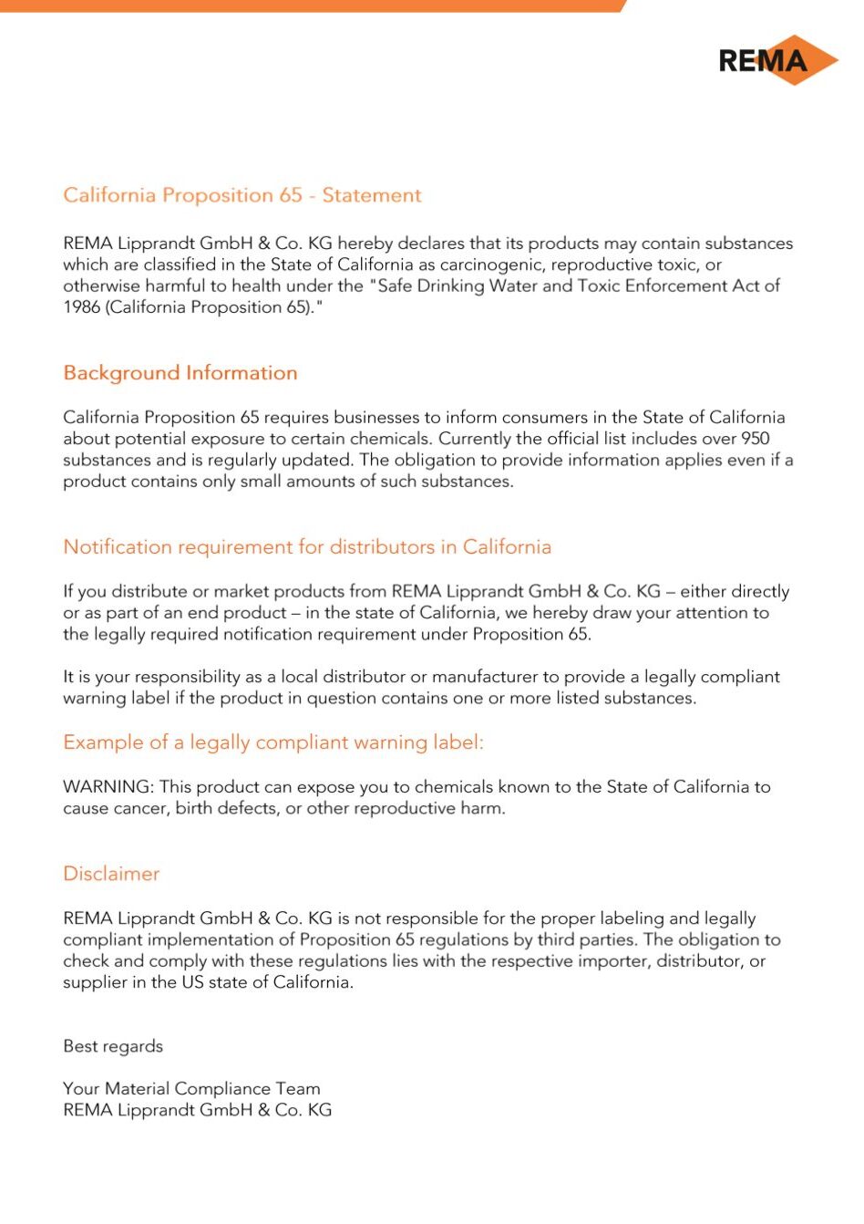California Proposition 65 - Declaration