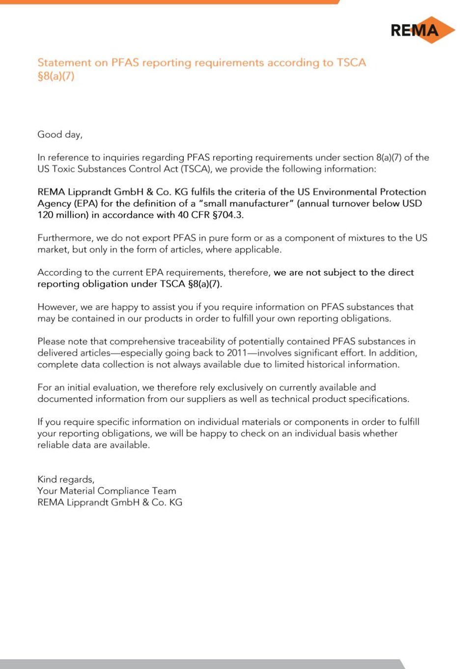 Statement on PFAS reporting requ irements under TSCA §8(a)(7)